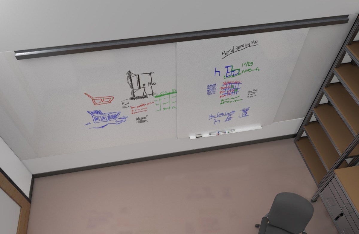 Concept rendering of sliding whiteboards on track in office