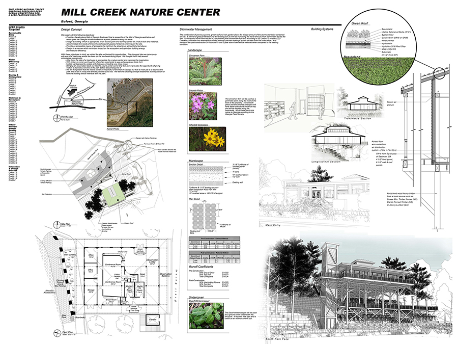 Design competition entry for a LEED Platinum nature center in Buford, GA, submitted to the 2007 USGBC Natural Talent Emerging Green Builders Design Competition, Southeast Region. This entry was an honorable mention. This was a collaborative effort with civil engineer, Martin Bowen.