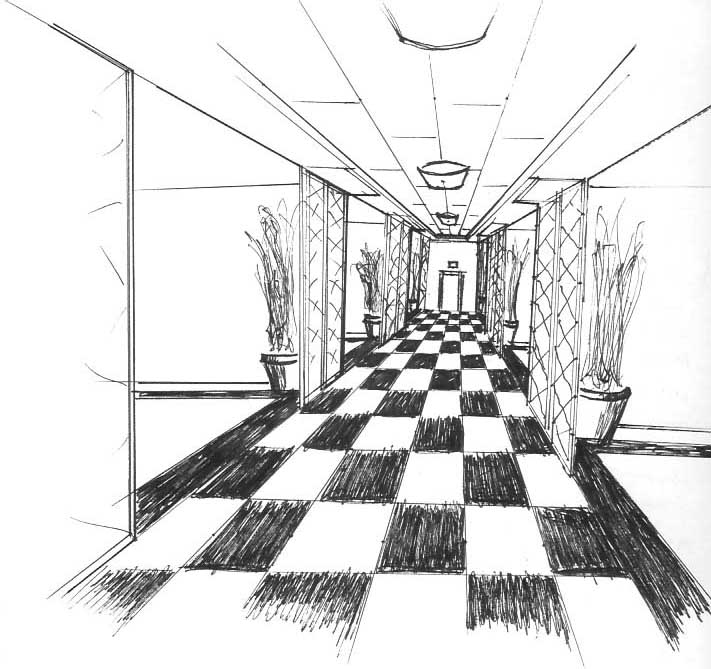 Concept Sketch for an Open-Plan Building Corridor
